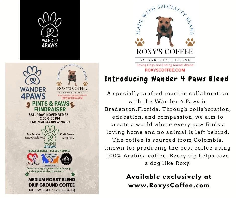 Every bag of Roxy’s Coffee Wander4Paws Blend does more than brighten your morning — it helps brighten the future for animals in need. A portion of every purchase is donated directly to Wander4Paws, supporting our mission to connect people, pets, and purpose.